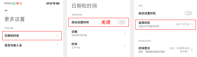 ③设置——更多设置——日期和时间,关闭自动设置时间,把时区设置成你目标国家的时区。