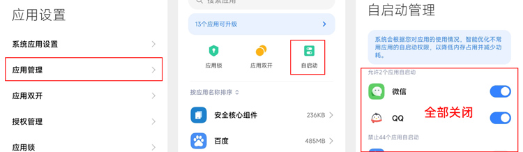 ②设置——应用设置——应用管理——自启动;应用自启动全部关闭,这样能够防止手机在没有连接国外网络的情况下,环境暴露了。