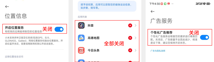 我们先来关闭掉一些功能:①设置——隐私保护——位置信息,关闭位置服务;运动健康全部选择拒绝;个性化广告推荐关闭。